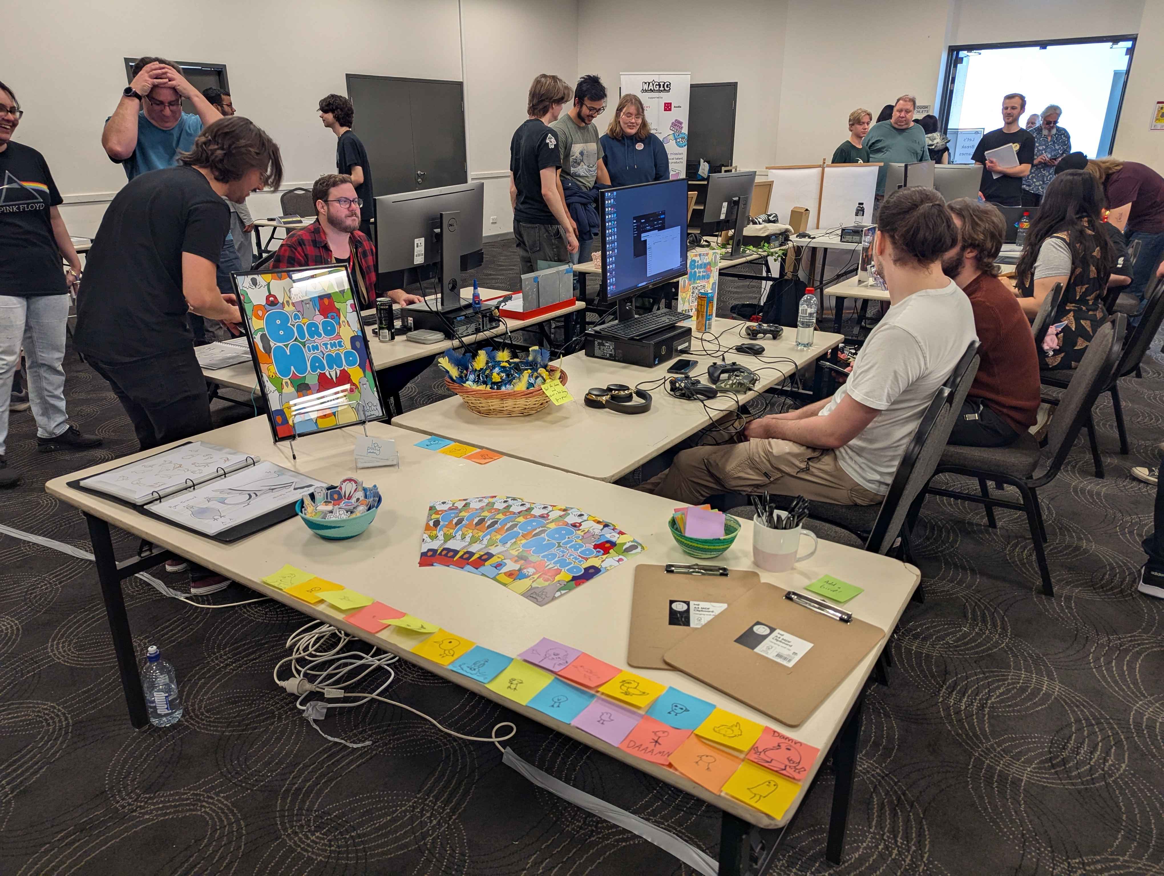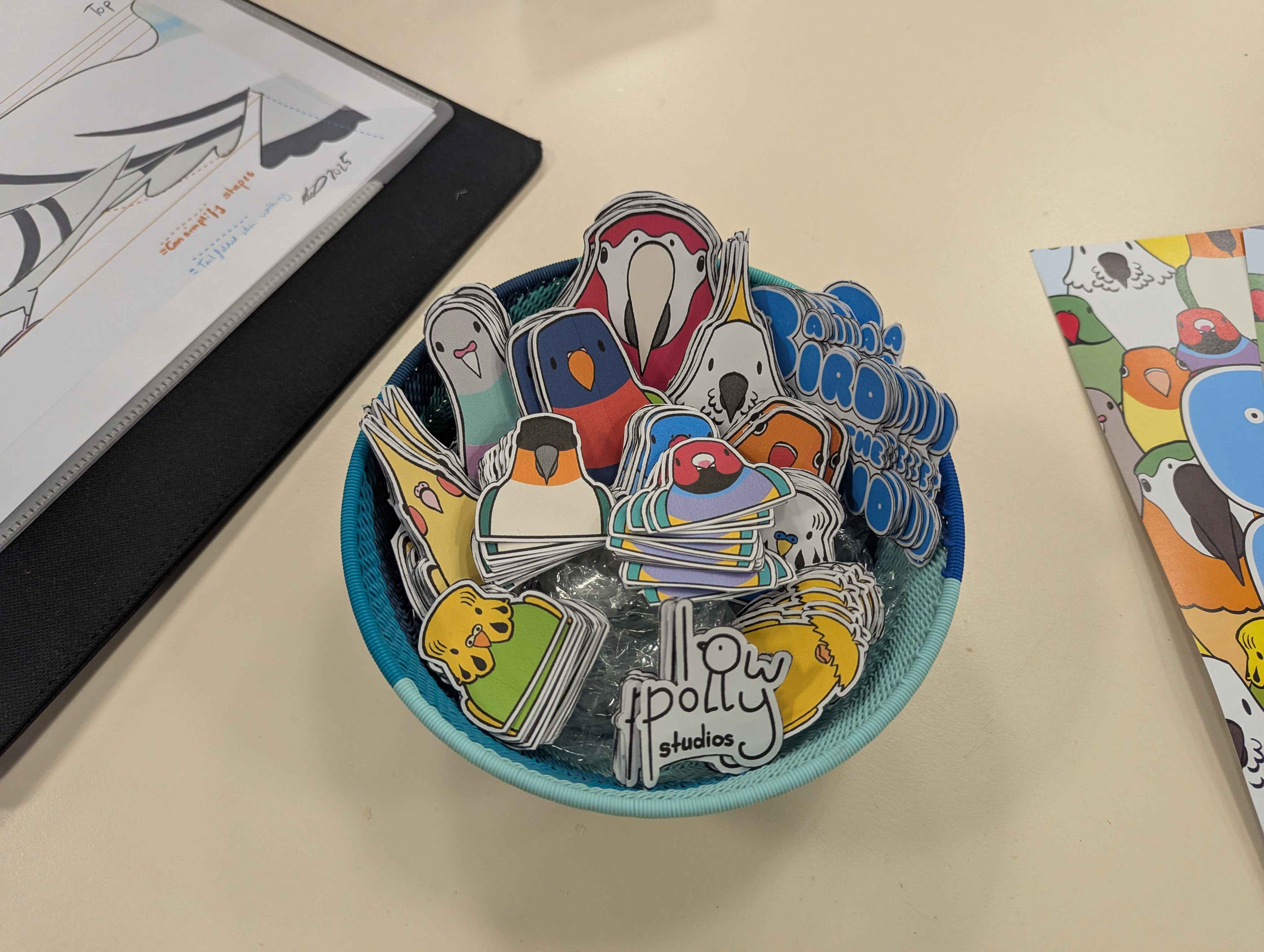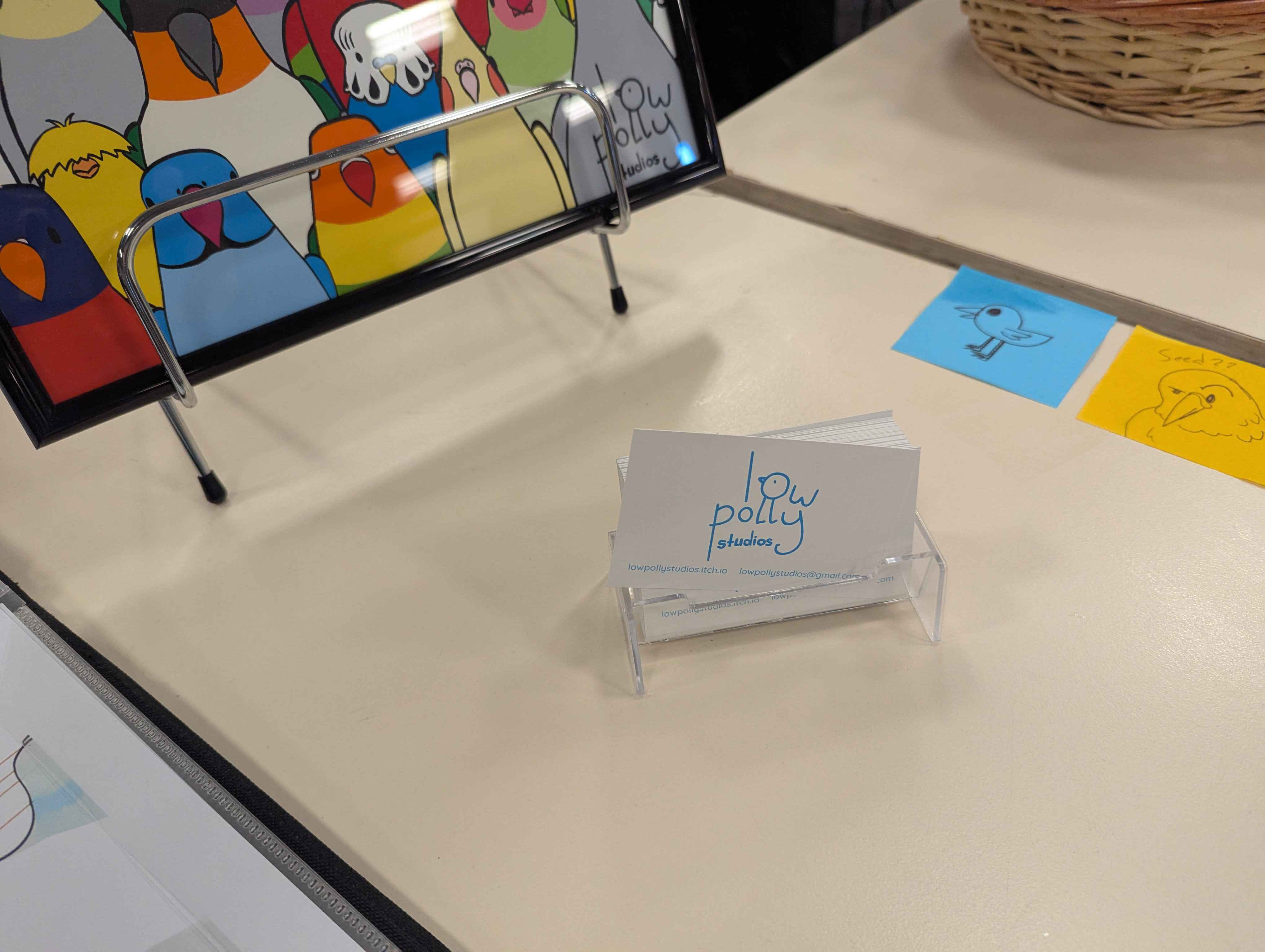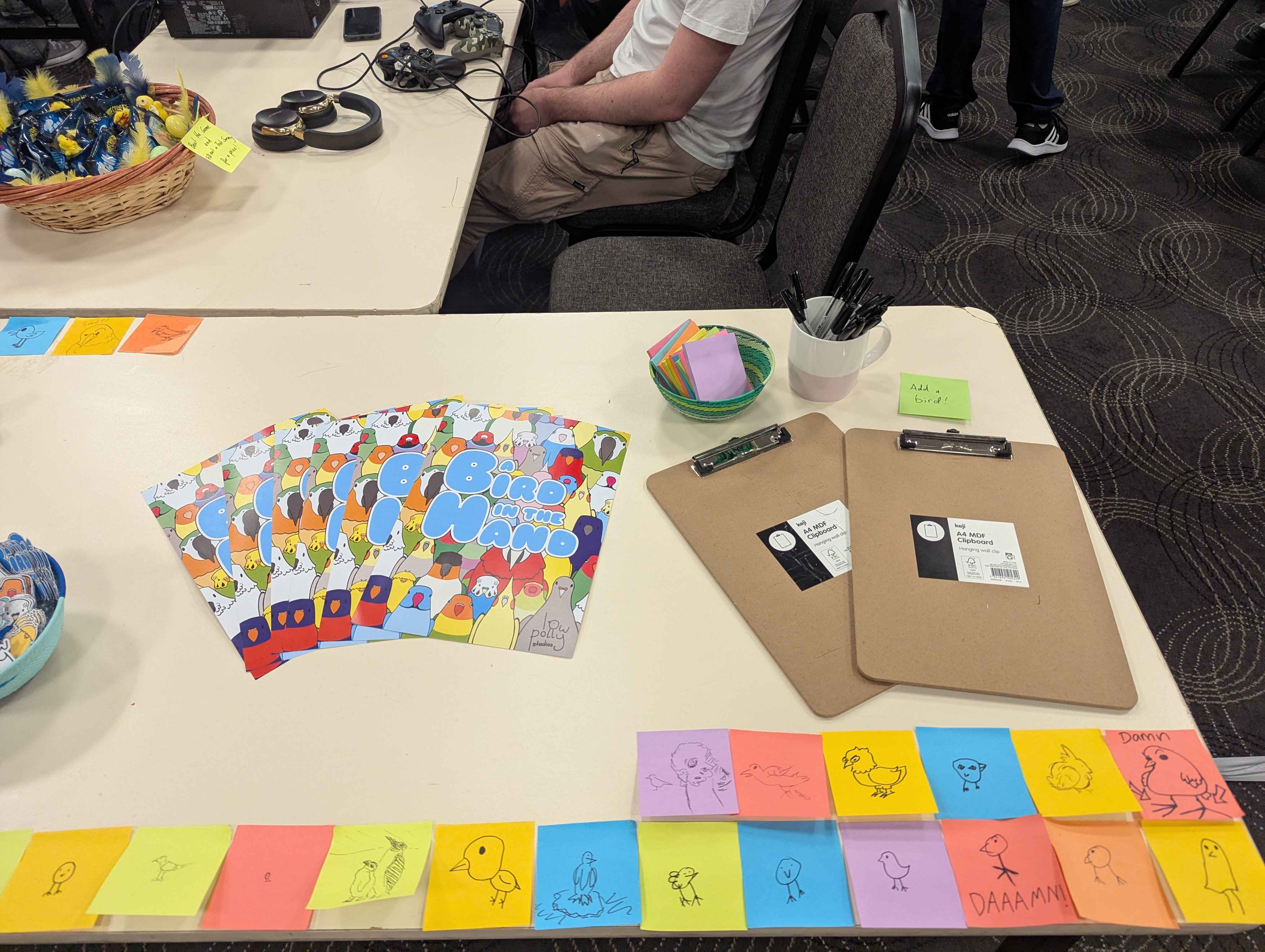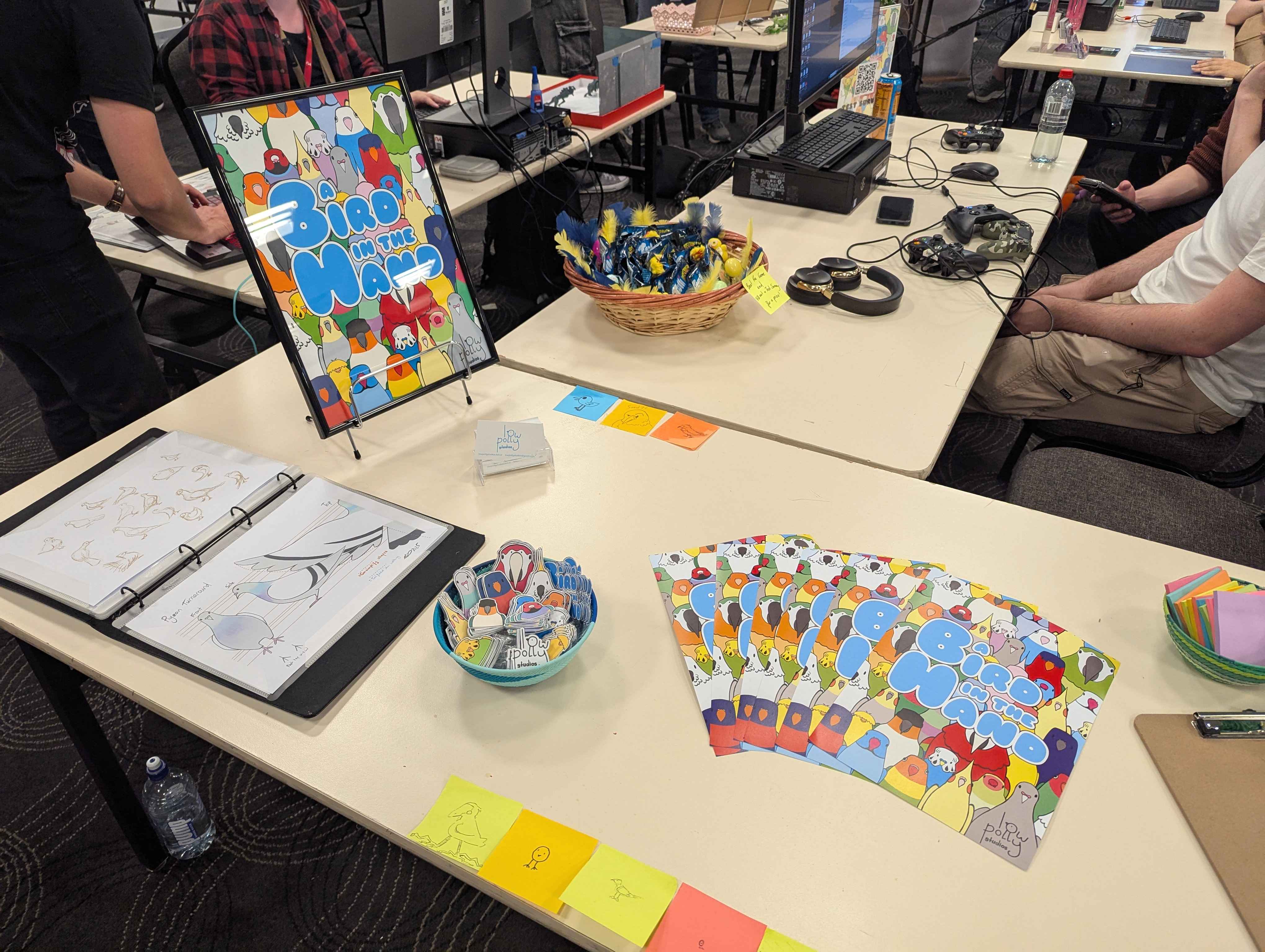 We set our table up with a variety of decorations and merch; concept art, stickers, gummy worms, prints and business cards. We also set up some stationary and sticky notes so that visitors to the table could draw a bird to add to our collection.